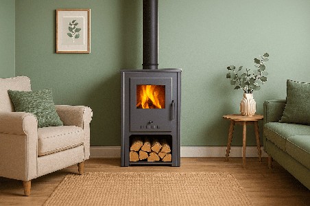 It features a 120 mm flue outlet and a lower compartment for firewood storage, offering functionality and aesthetics in a single unit. Perfect for those seeking comfort, style and sustainability in home heating.