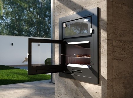 Horno-barbacoa para encastrar fabricado en acero inoxidabe de color negro con encendido manual y recomendado para 6 – 10 comensales. Salida de humos de 150 mm está diseñada para un flujo eficiente de aire, reduciendo el riesgo de acumulación de humo y garantizando una cocción más limpia y saludable. Medidas: 89,3×73,5 cm (alto/ancho). Incluye parrillas..